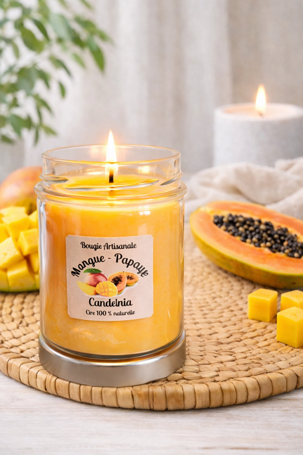 Les bougies Mangue papaye Candelnia vous offriront un voyage exotique. Partons sous les cocotiers.