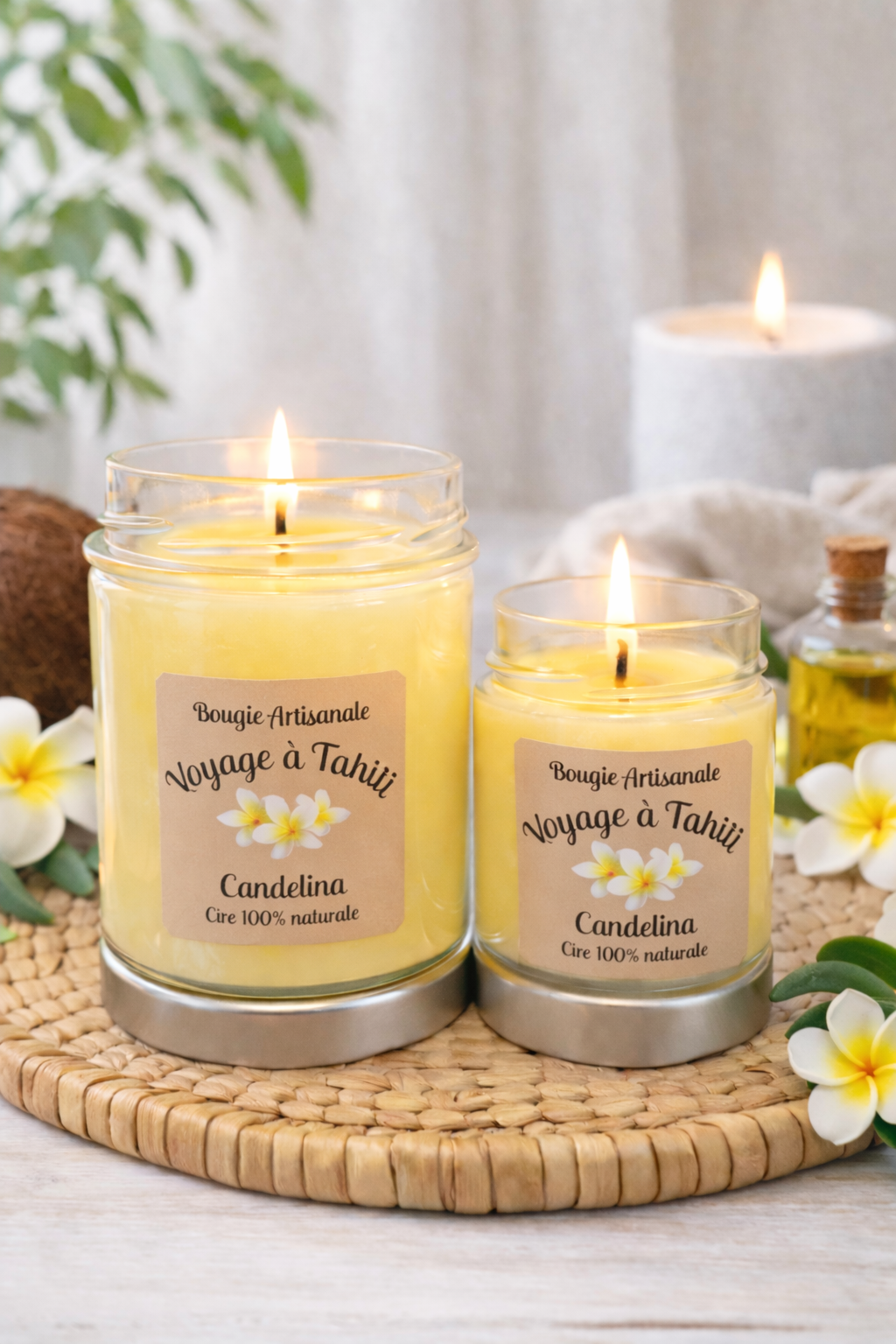 Avec une senteur de Monoï, les bougies Voyage à Tahiti Candelnia vous feront voyager au bord de la mer. Laissez emporter !